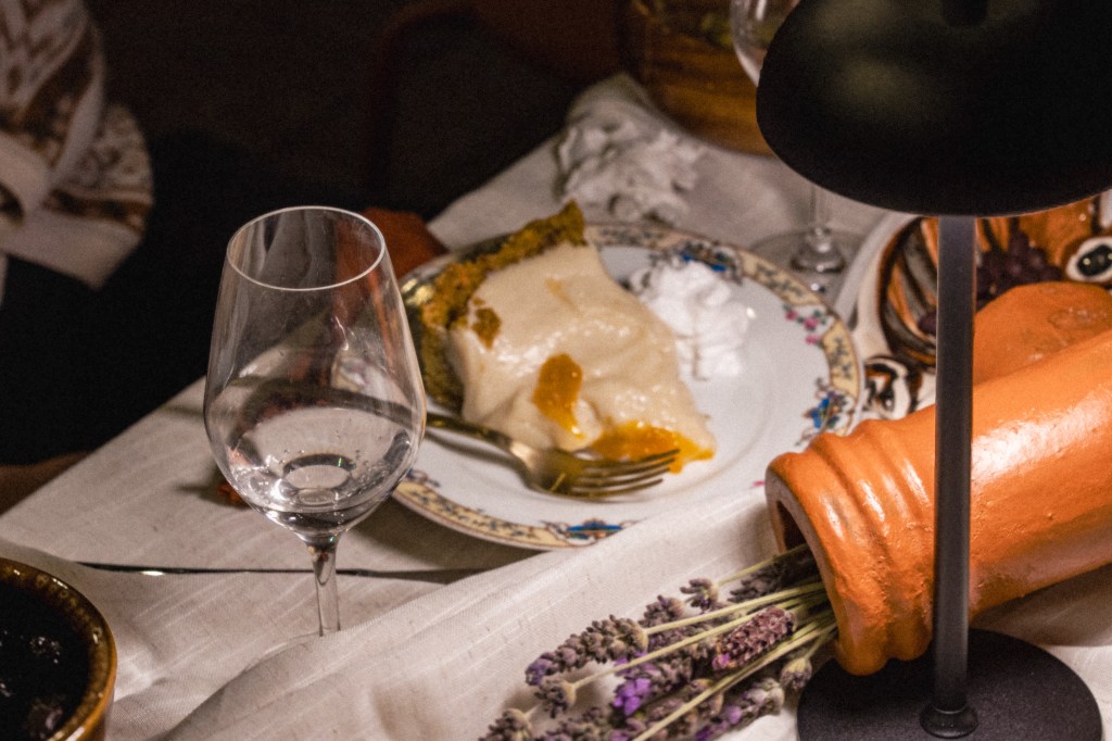 Dessert was a Turkish coffee cake-inspired vegan cheesecake. The filling was flavored with orange blossom water and cardamom. The crust was pistachio, almond, and brown sugar.